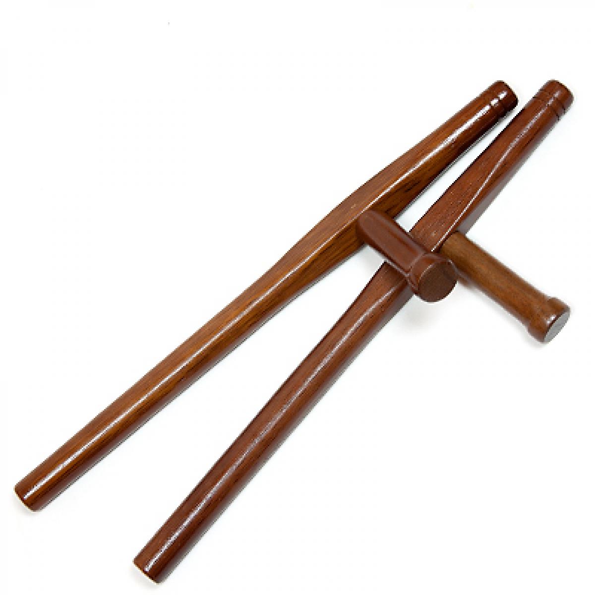 Tonfa en bois rond rouge naturel. Longueur 50cm, poignée 11.5cm. Vendu à la paire.